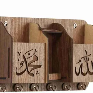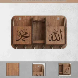 Material: MDF Laminated• Number Of Pieces: 1 Pc• Product Design: Allah Muhammad Design• Product Feature: Adds Style And Personality To Any Space• Color: Brown• Package Includes: 1 x Key Holder• Length: 11 Inches• Width: 5 Inches• Height: 3 Inches• ? Stylish Hook Stand• ? Easy To Install with Nail/Screw.• ? Mobile Charging Stand with Mobile Holder.• ? AC Remote Holder• ? TV Remote Holder• ? Wall Hanging• Note: There might be an error of 1-3 cm due to manual measurement, and slight color differences may occur as a result of varying lighting and monitor effects.• Product Code: MZ1261200212MRTS