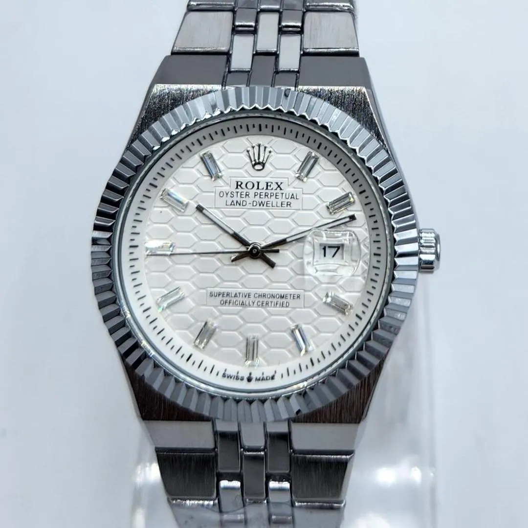 Dial: Unique White Honeycomb Texture Dial with index hour markers. Case & Bezel: Polished Silver-Tone Case with a signature Fluted Bezel. Movement: Accurate and reliable Quartz (Battery-Powered) movement. Bracelet: Integrated style, Silver-Tone Metal Bracelet for a comfortable and secure fit. Functionality: Three-hand display (hours, minutes, seconds) with a Date Window at the 3 o’clock position w
